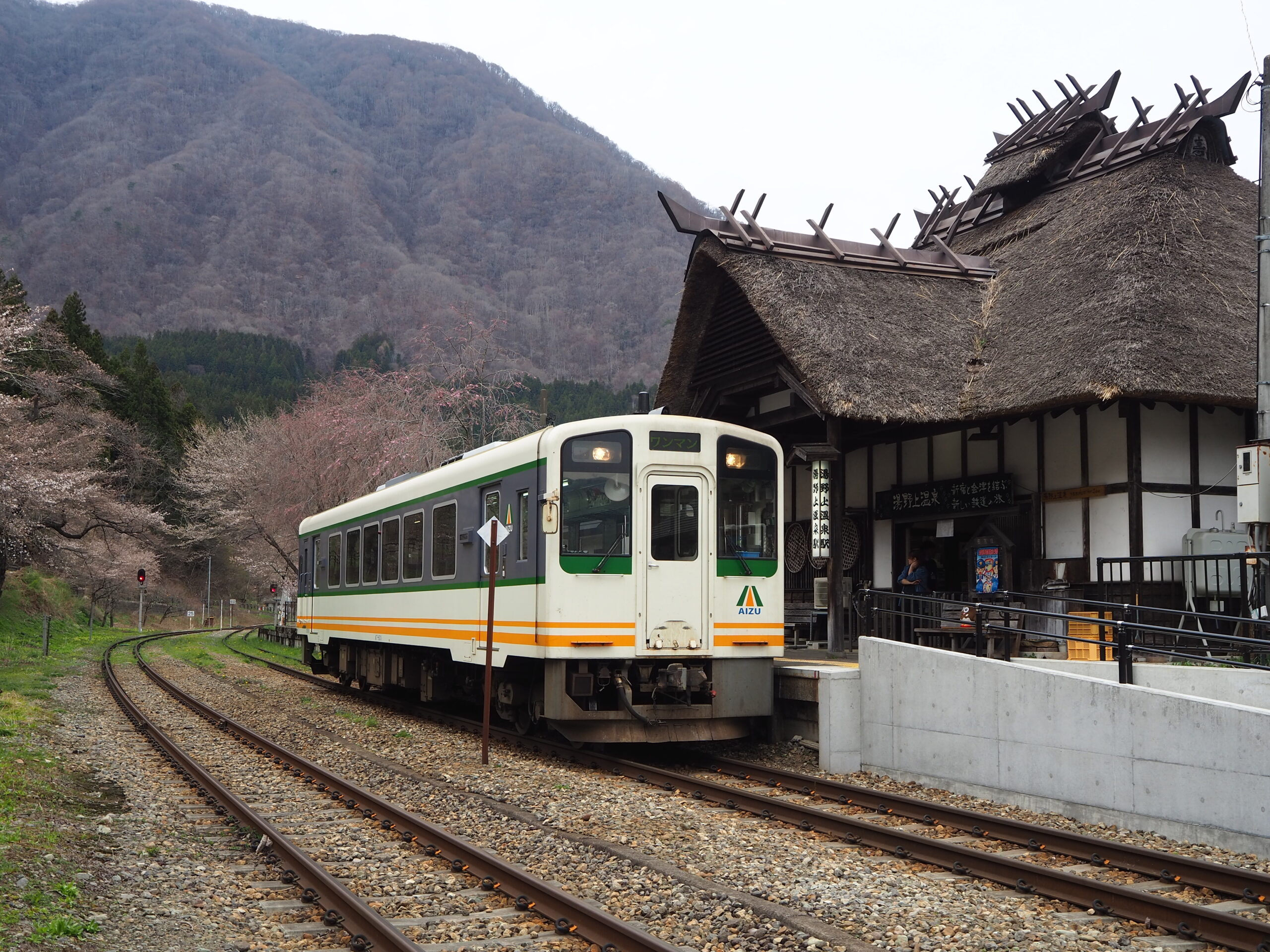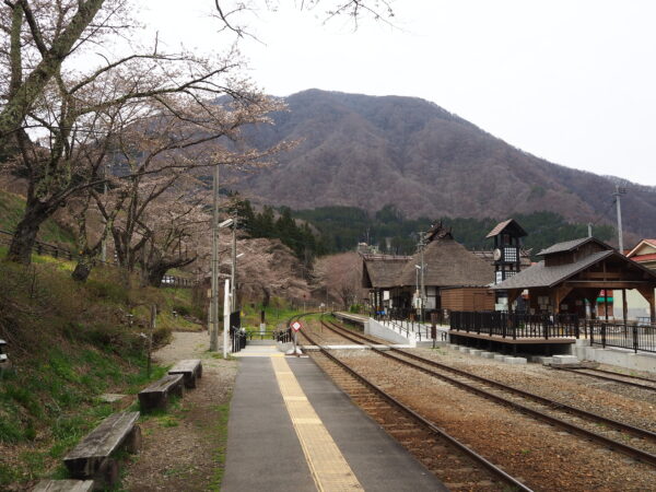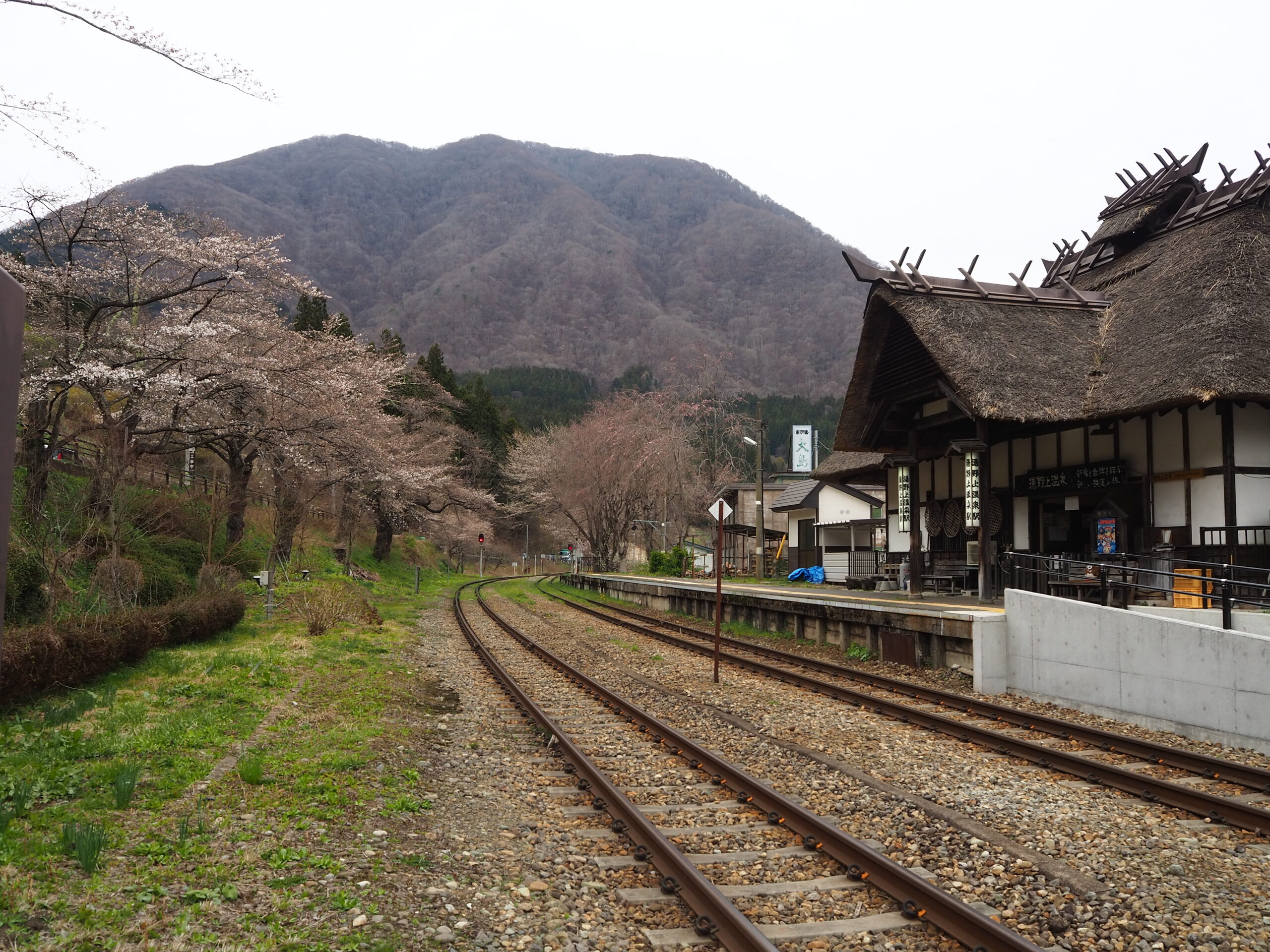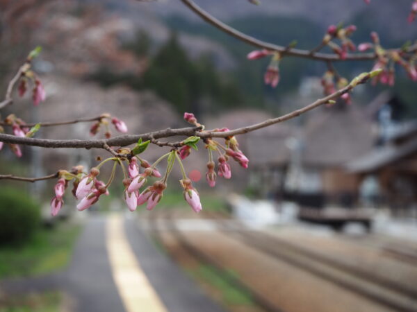 昨日の夕方近くの #湯野上温泉駅 の写真です🌸 線路沿いの様々な種類の #桜 も開花が始まってきました✨ 来週あたりが見頃かと思われます👀